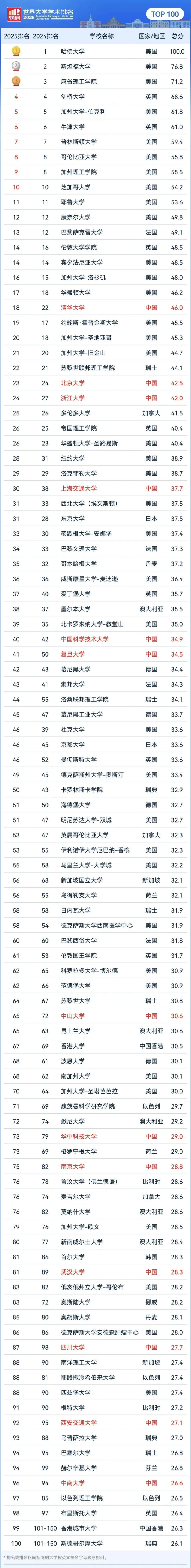 榜单显示,2025年世界大学学术百强前十的高校分别为哈佛、斯坦福、麻省理工、剑桥、加州大学(伯克利)、牛津、普林斯顿、哥伦比亚、加州理工和芝加哥大学。