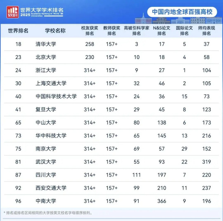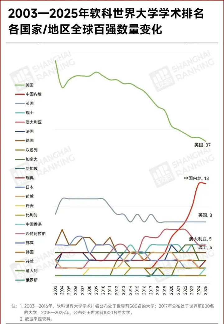 中国高校虽起步较晚,但后来居上,2025年世界大学学术百强榜单中,中国共有13所高校上榜,分别为清华、北大、浙大、上交、中科大、复旦、中山、华科、南大、武大、川大、西安交大和中南大学。